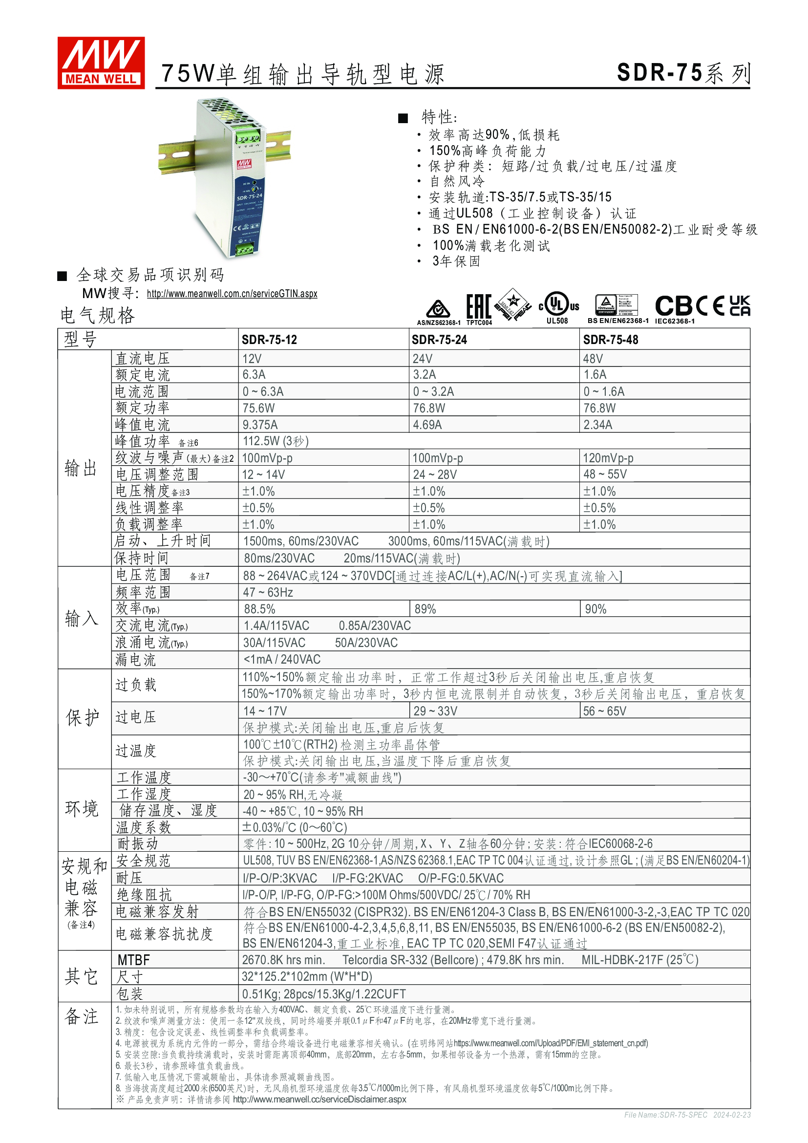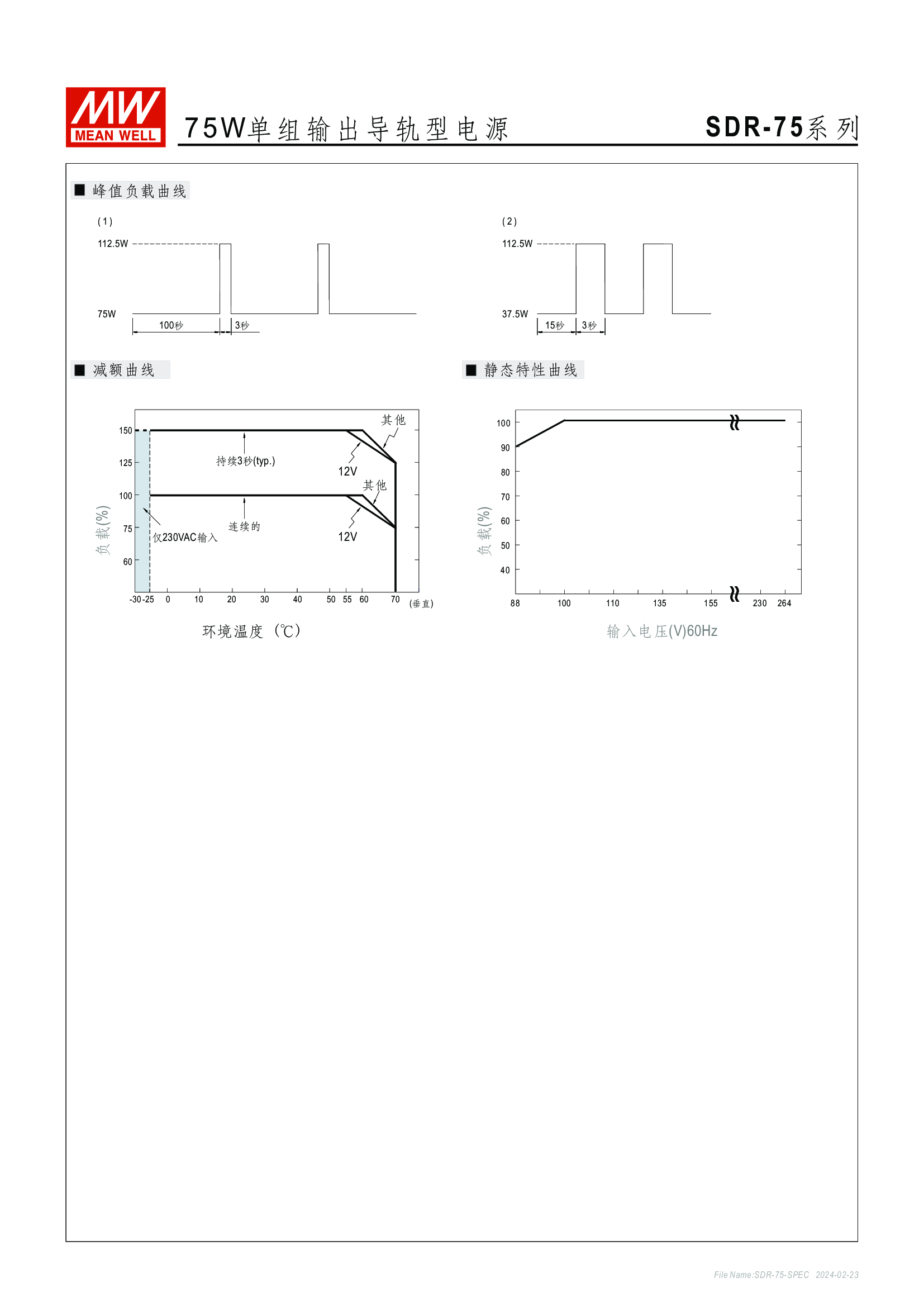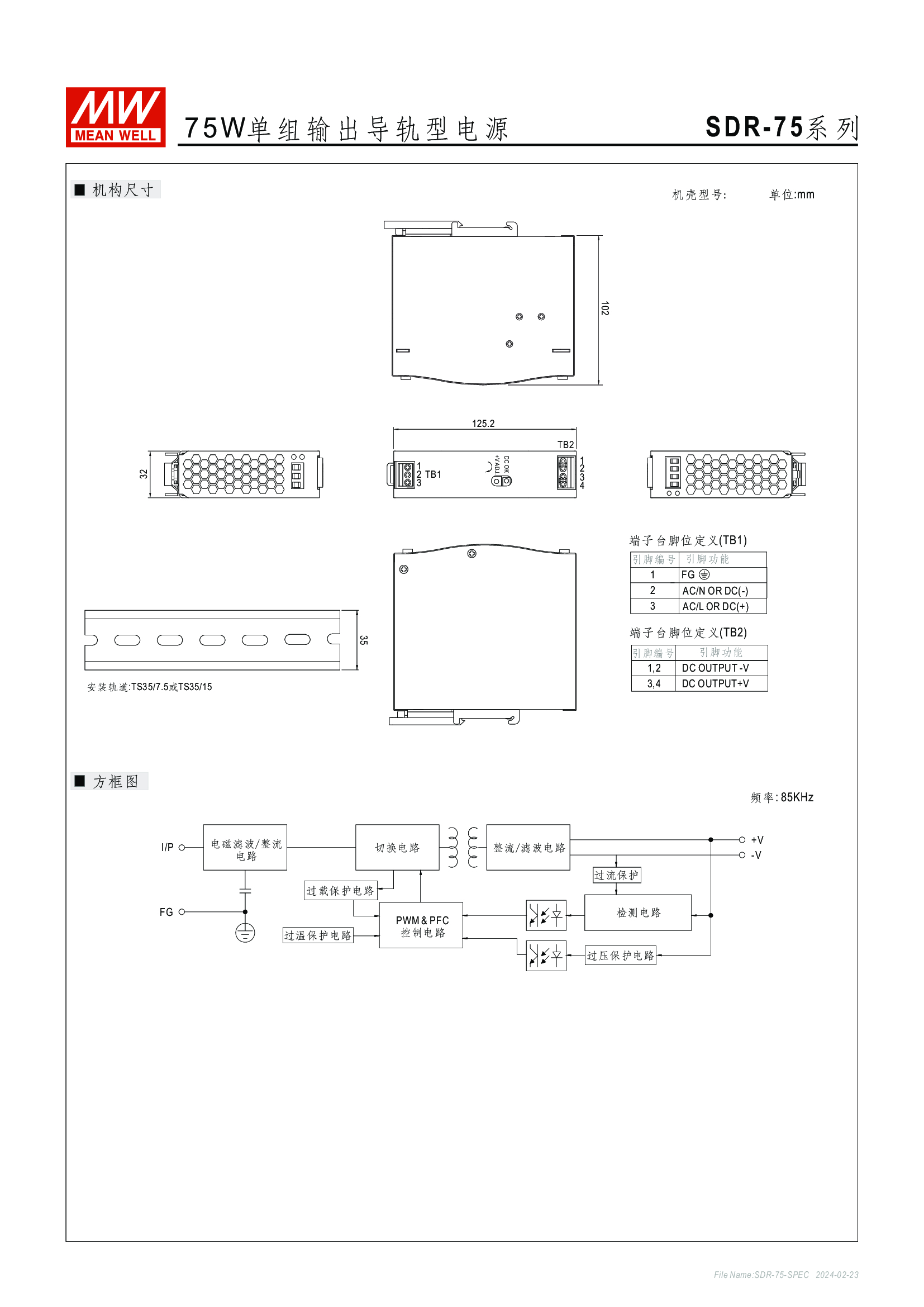金屬殼,薄型設(shè)計(jì) 單相,全范圍輸入 (SDR-960:230VAC) 94%高效率, 完整功能 內(nèi)建主動(dòng)式功率因子矯正功能(active PFC) (SDR-75除外) 適合安裝于DIN rail TS-35 / 7.5 或 15 內(nèi)建DC OK繼電器接點(diǎn)(Relay contact) (SDR-75除外) 可提供130%~150%峰值負(fù)載輸出(依機(jī)型) 并聯(lián)功能(SDR-480P/960)