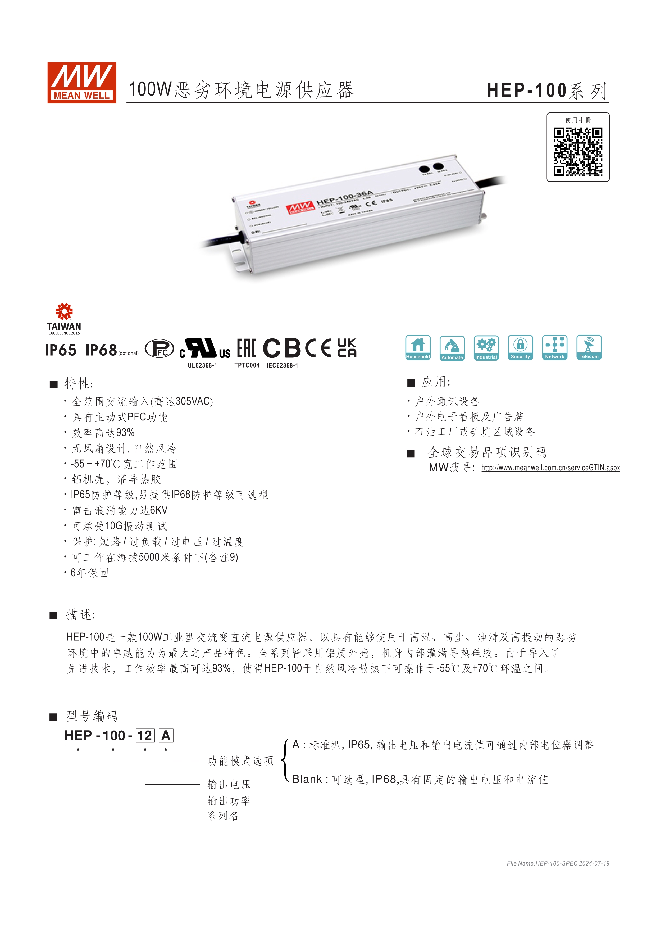無(wú)風(fēng)扇設(shè)計(jì) 具96%超高效率 工作溫度范圍寬達(dá)-55~+70℃ 采用金屬外殼、IP65設(shè)計(jì)(另有IP68選購(gòu)機(jī)型),可承受10G震動(dòng)測(cè)試 操作海拔高度可達(dá)5000公尺 內(nèi)建CANBus、PMBus,可選MODBus (僅1000W和2300W可提供) 適用于高溫/低溫、高塵、高濕、高震動(dòng)、高鹽分的戶外或嚴(yán)苛環(huán)境 6年保固期