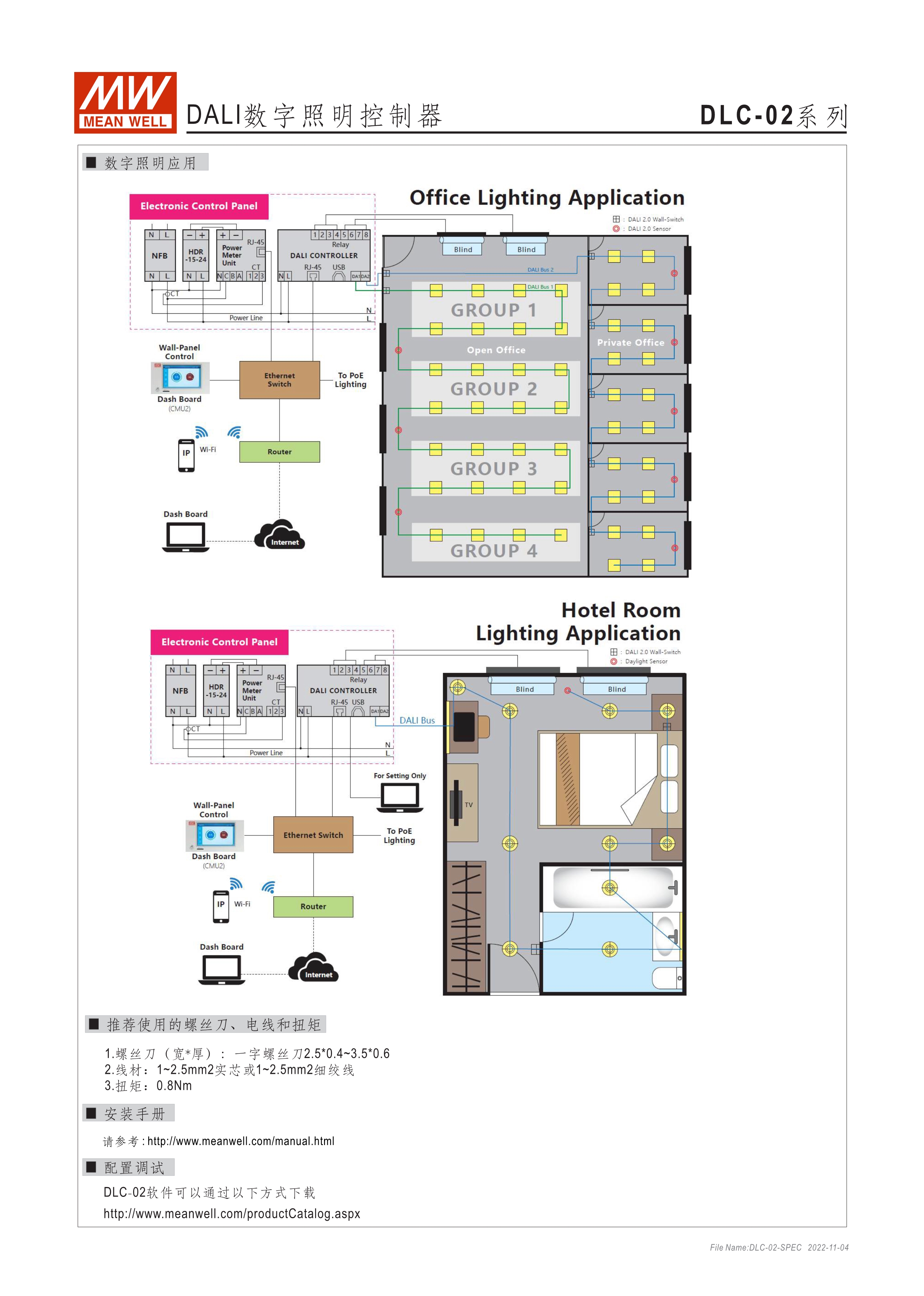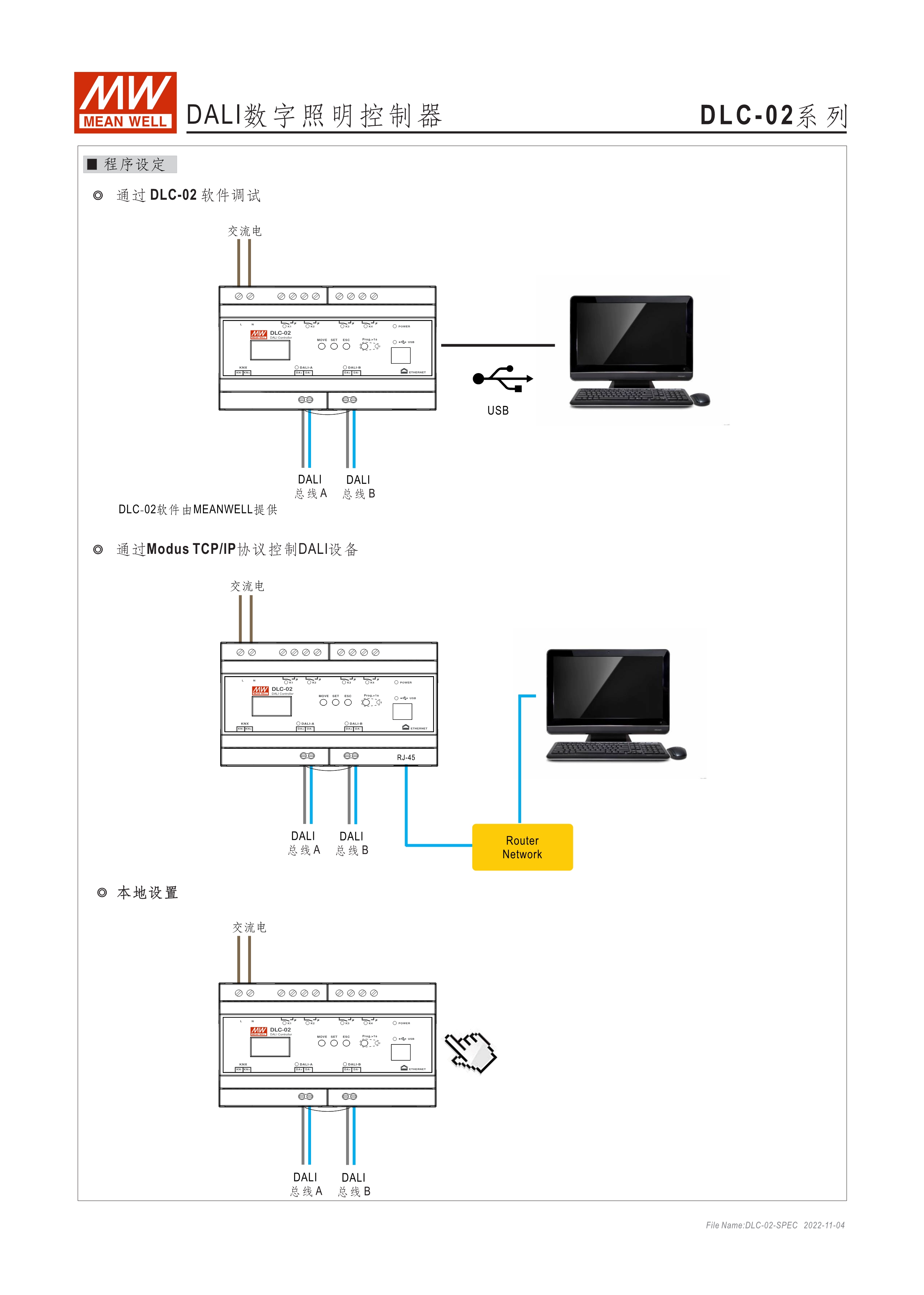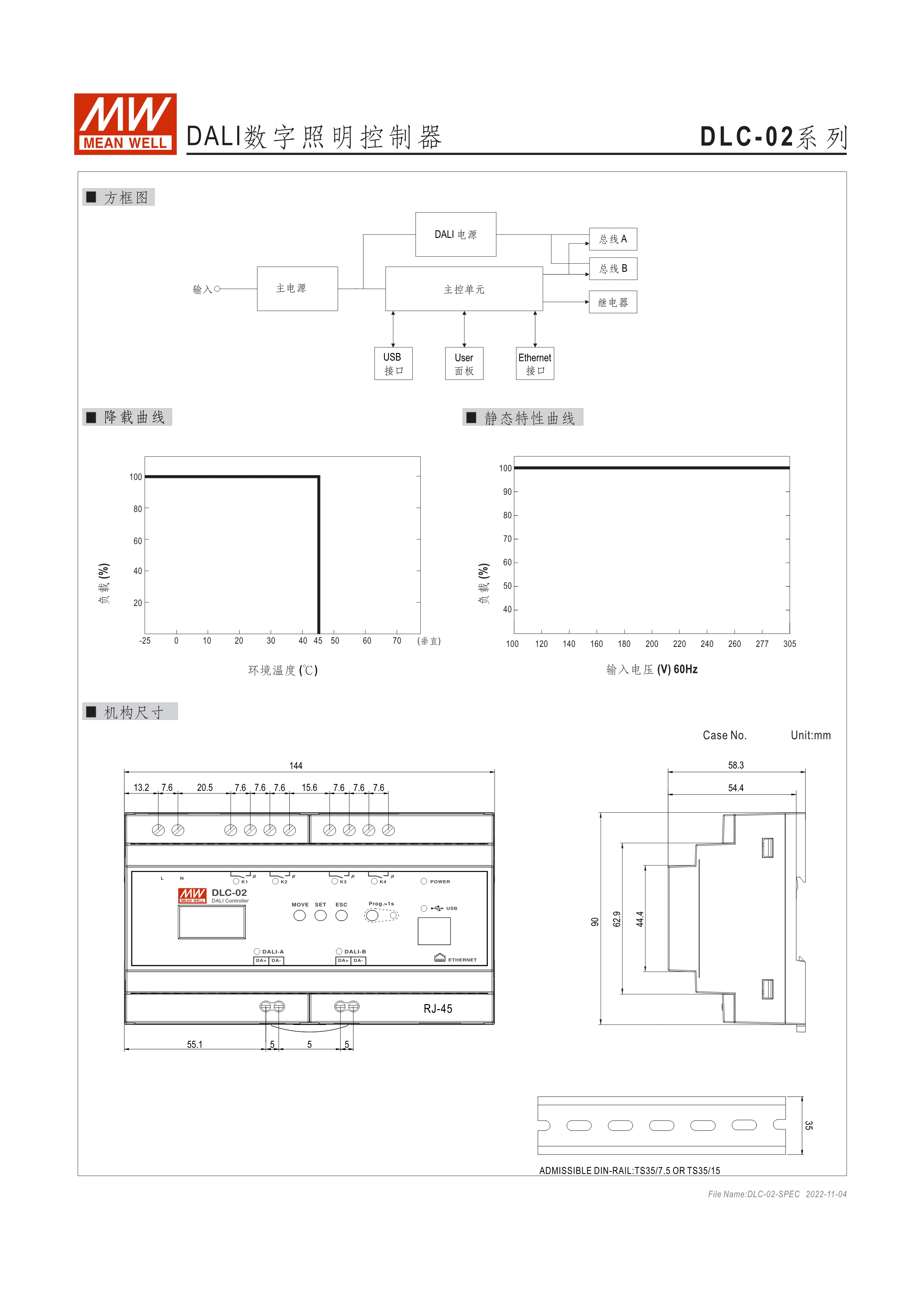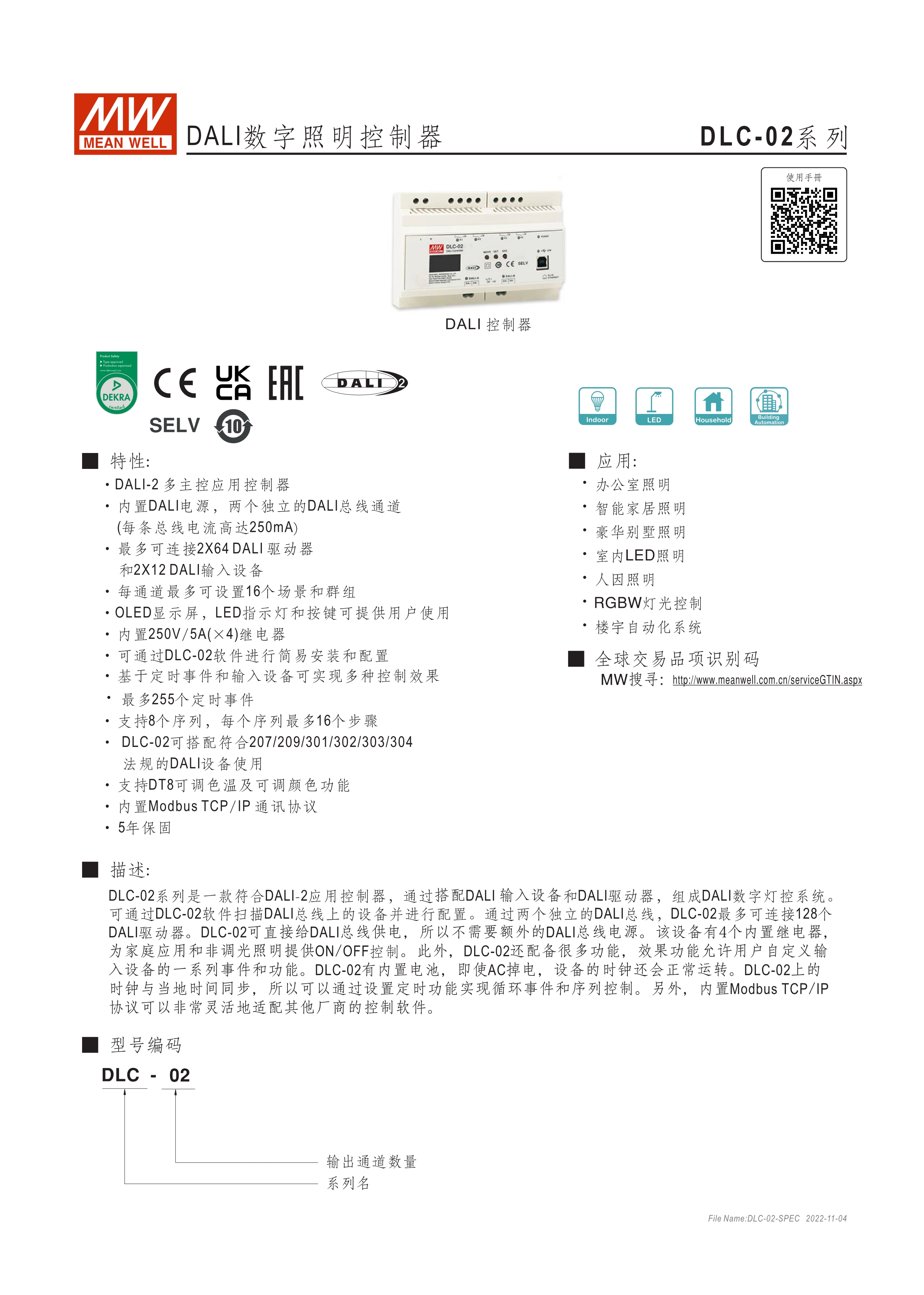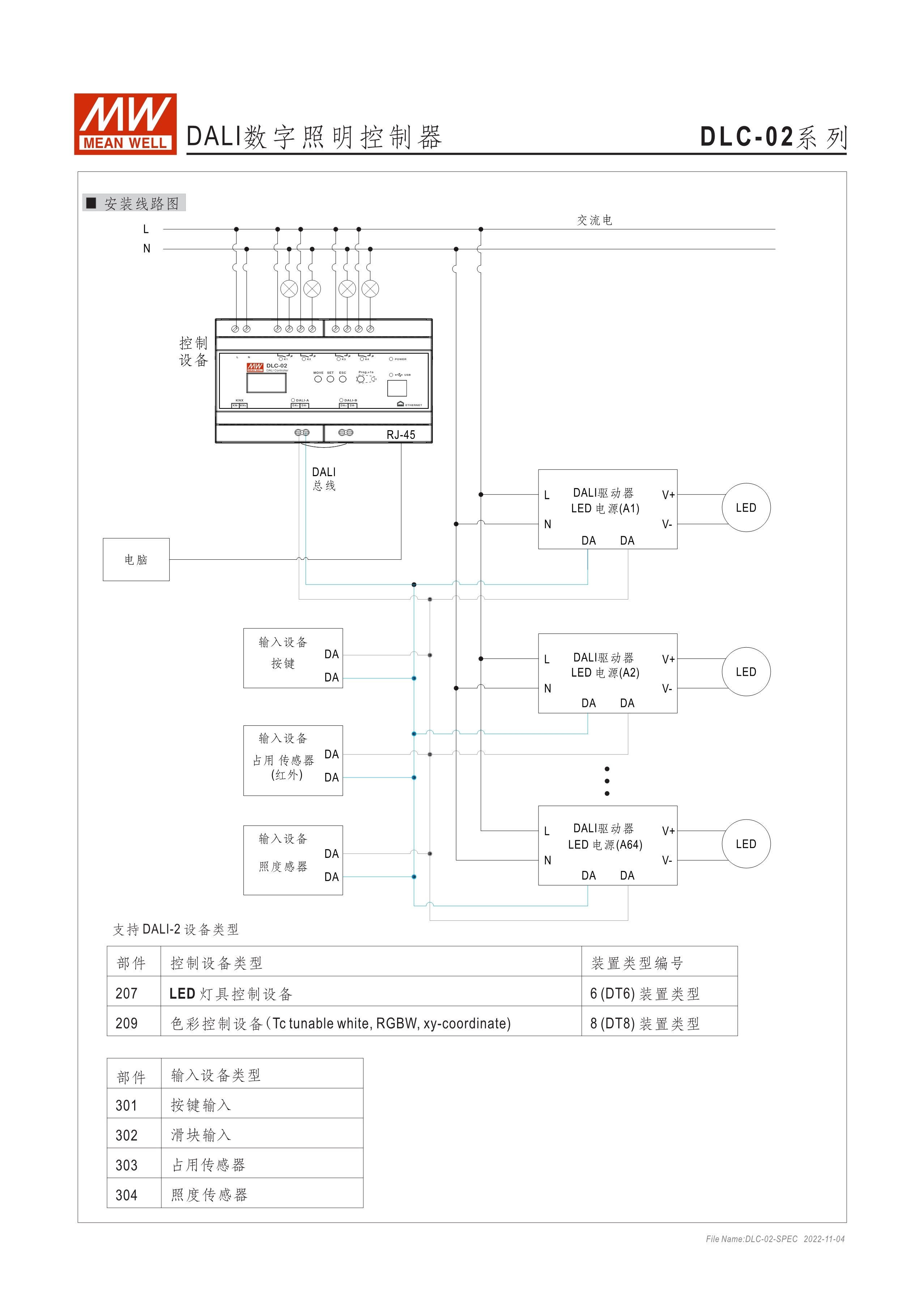 符合IEC 62386 DALI-2,Part 101/103/207/208/301/302/303/304標(biāo)準(zhǔn) 2組獨(dú)立DALI總線,可接Control Gear及Control Device搭配使用 4路可控繼電器,接觸容量5A,可當(dāng)電器開關(guān)或兩組電動(dòng)窗簾使用 可搭配DLC軟體做現(xiàn)場(chǎng)系統(tǒng)設(shè)定,或透過(guò)網(wǎng)路線從遠(yuǎn)端做修改設(shè)定 透過(guò)本體液晶顯示螢?zāi)患安倏匕粹o,可做簡(jiǎn)單設(shè)定和狀態(tài)查詢 內(nèi)建Timer晶片,可搭配DLC軟體做行程控制設(shè)定 通訊介面接口:RJ-45及KNX,可與其他樓宇自動(dòng)化系統(tǒng)做連線擴(kuò)充使用 采導(dǎo)軌式設(shè)計(jì),體積小巧僅8SU寬度(144x 90x 58.4mm)