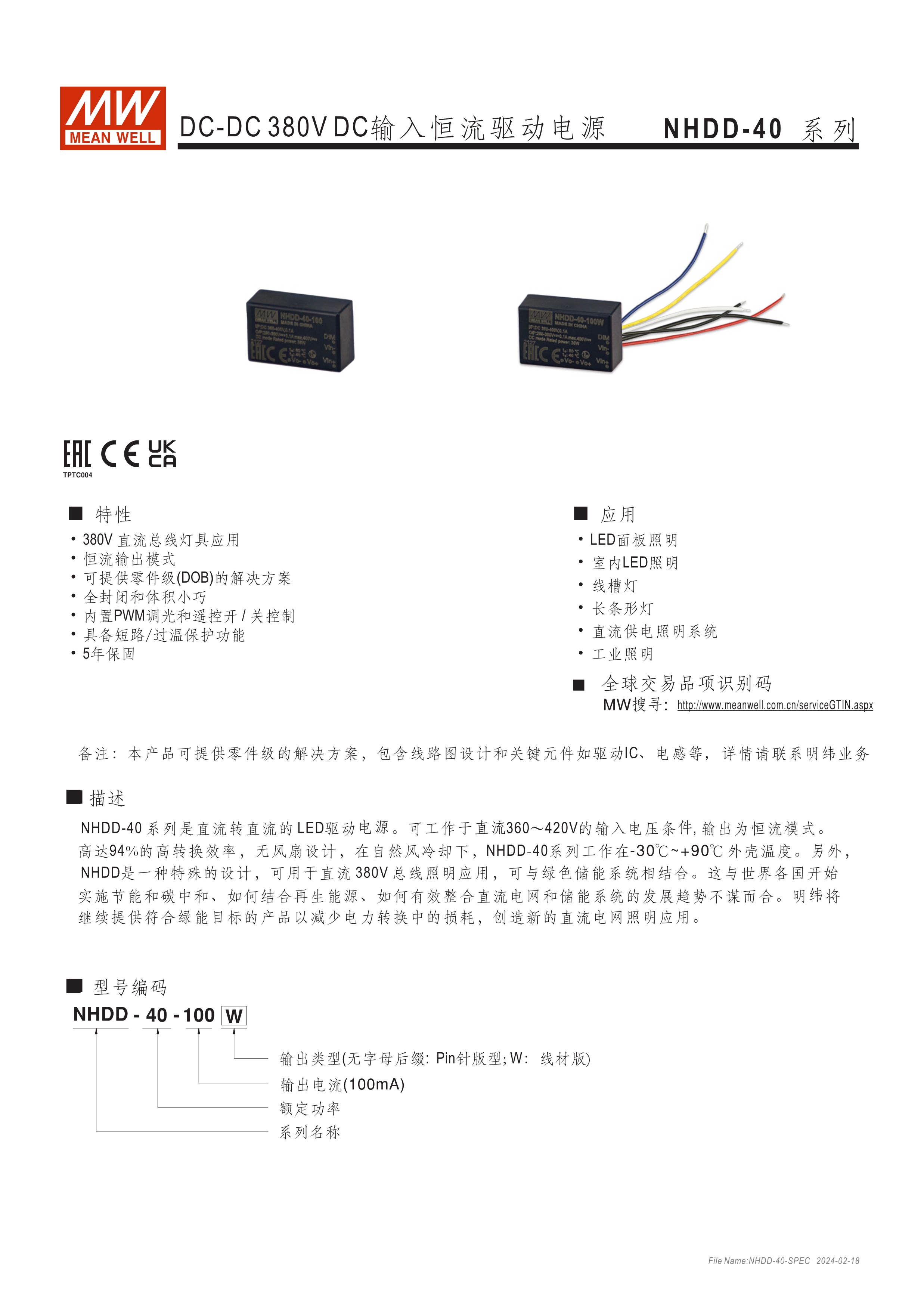 恒流模式輸出 為DC 380V BUS照明燈具提供電路板型(DoB)解決方案 塑料外殼和全封裝 內(nèi)建PWM和遠(yuǎn)程開關(guān)控制 保護(hù):短路/過溫 5年保固