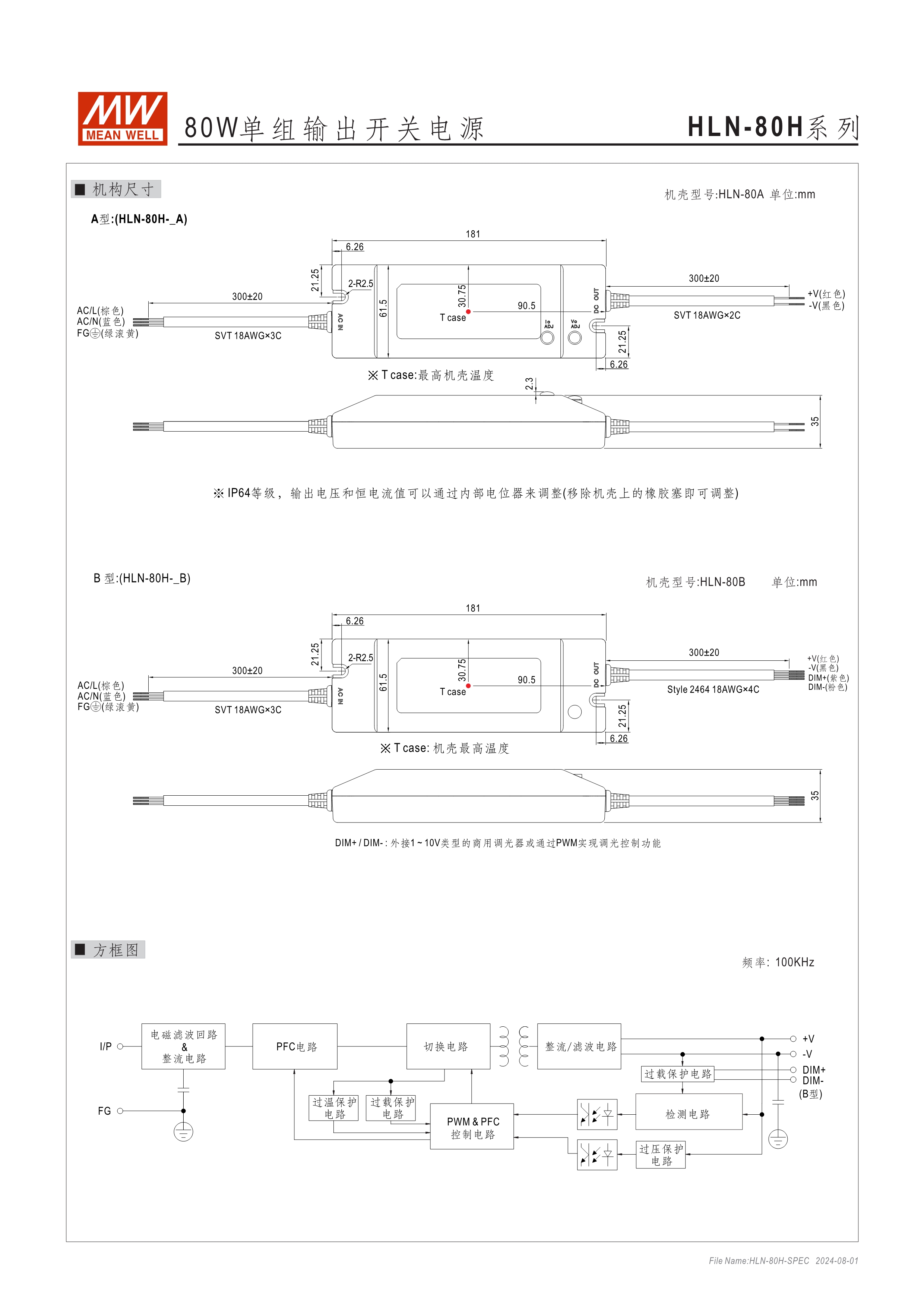 90~305VAC交流輸入, 內(nèi)建主動(dòng)式功率因子矯正功能(active PFC) 塑料外殼,IP64防護(hù)等級(jí) B type機(jī)種:內(nèi)建三合一調(diào)光功能(1~10VDC,PWM信號(hào)或電阻) A type機(jī)種:用戶可彈性調(diào)整輸出電壓與電流 適合于LED室內(nèi)照明及LED電子廣告牌相關(guān)應(yīng)用