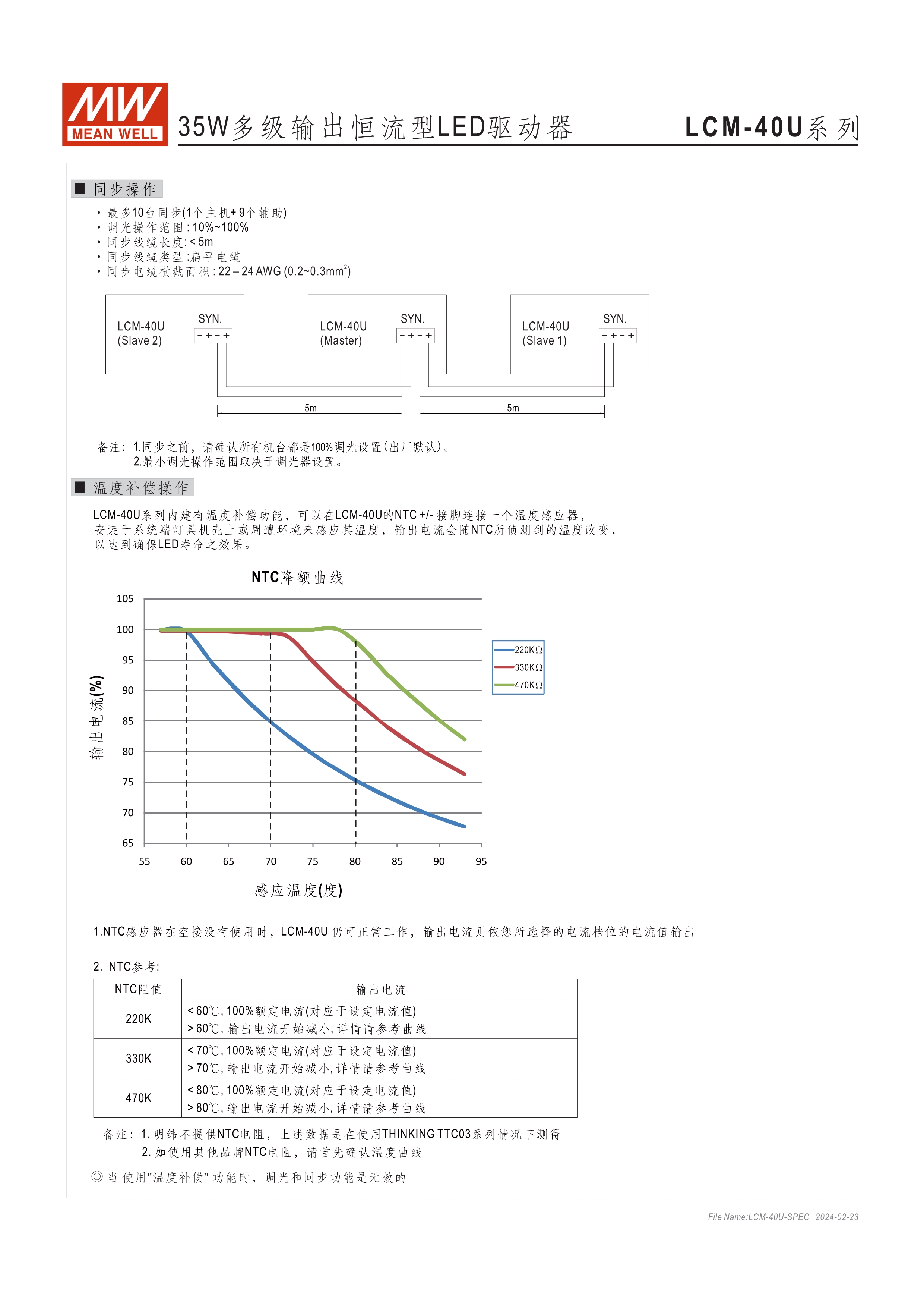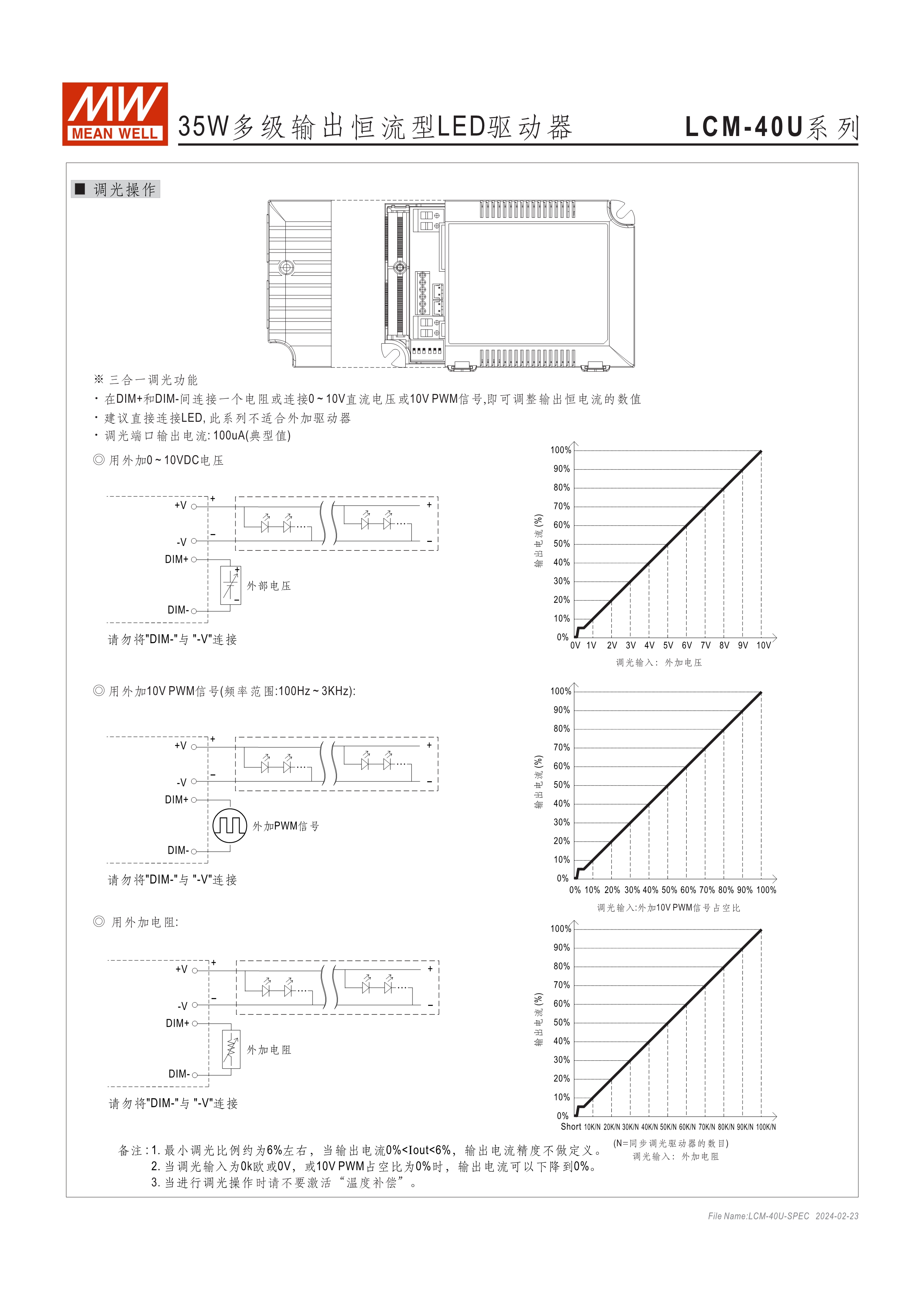 LCM-40U(DA)/60U(DA):90~132VAC交流輸入 內(nèi)建主動(dòng)式功率因子矯正功能(active PFC) 塑料外殼 可透過指撥開關(guān)切換不同輸出電流檔位之多段式電源 LCM-40U/60U內(nèi)建三合一調(diào)光功能(0~10VDC, PWM信號(hào)或電阻,可關(guān)斷) LCM-40UDA/60UDA內(nèi)建DALI接口 和按鈕調(diào)光功能(Push Dim) 適合于LED室內(nèi)照明相關(guān)應(yīng)用
