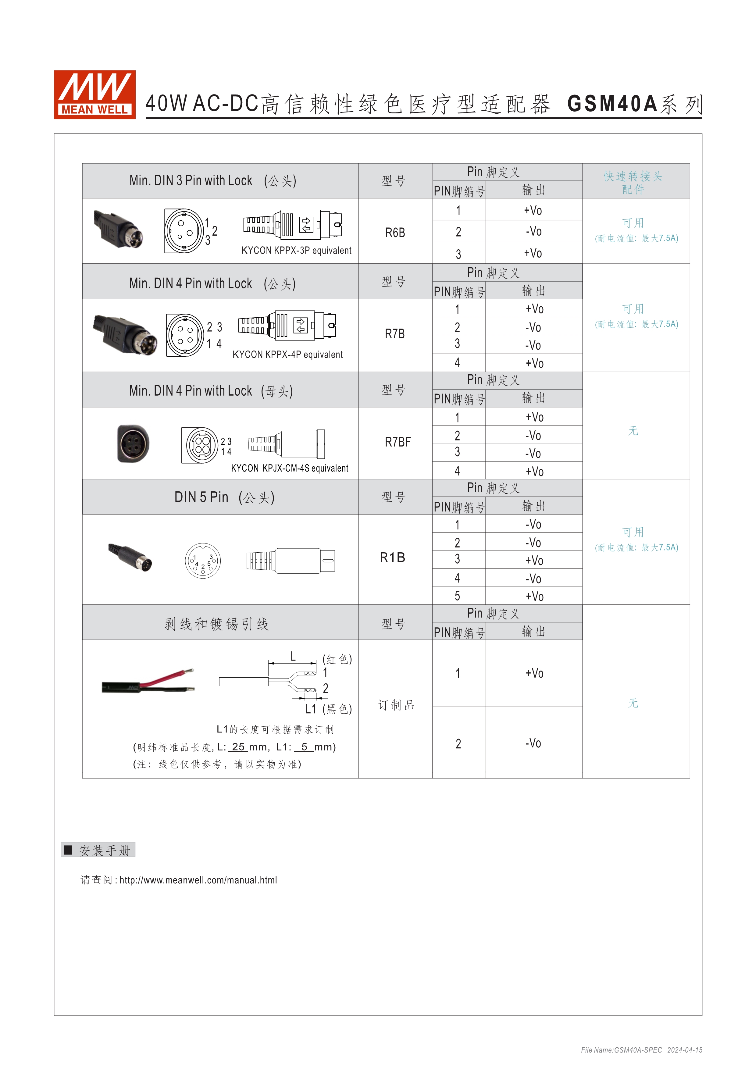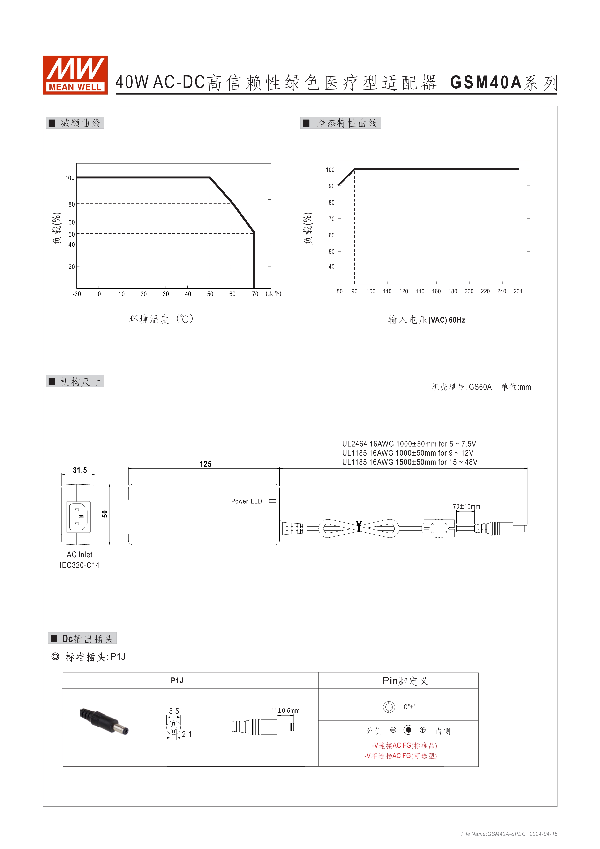 通過(guò)醫(yī)療60601-1認(rèn)證(2xMOPP),BF應(yīng)用(僅B型) 能效 VI 級(jí) 空載損耗<0.1W~0.15W 符合EISA/DoE、NRCan、ErP 及CoC Version 5 A型:Class I 電源(有接地PIN),IEC 320-C14接口 B型:Class II 電源(無(wú)接地PIN),IEC 320-C8接口 極端漏電流<50~175uA(依型號(hào)) -30~+70℃工作溫度 多種DC輸出轉(zhuǎn)接頭可更換 3年保固