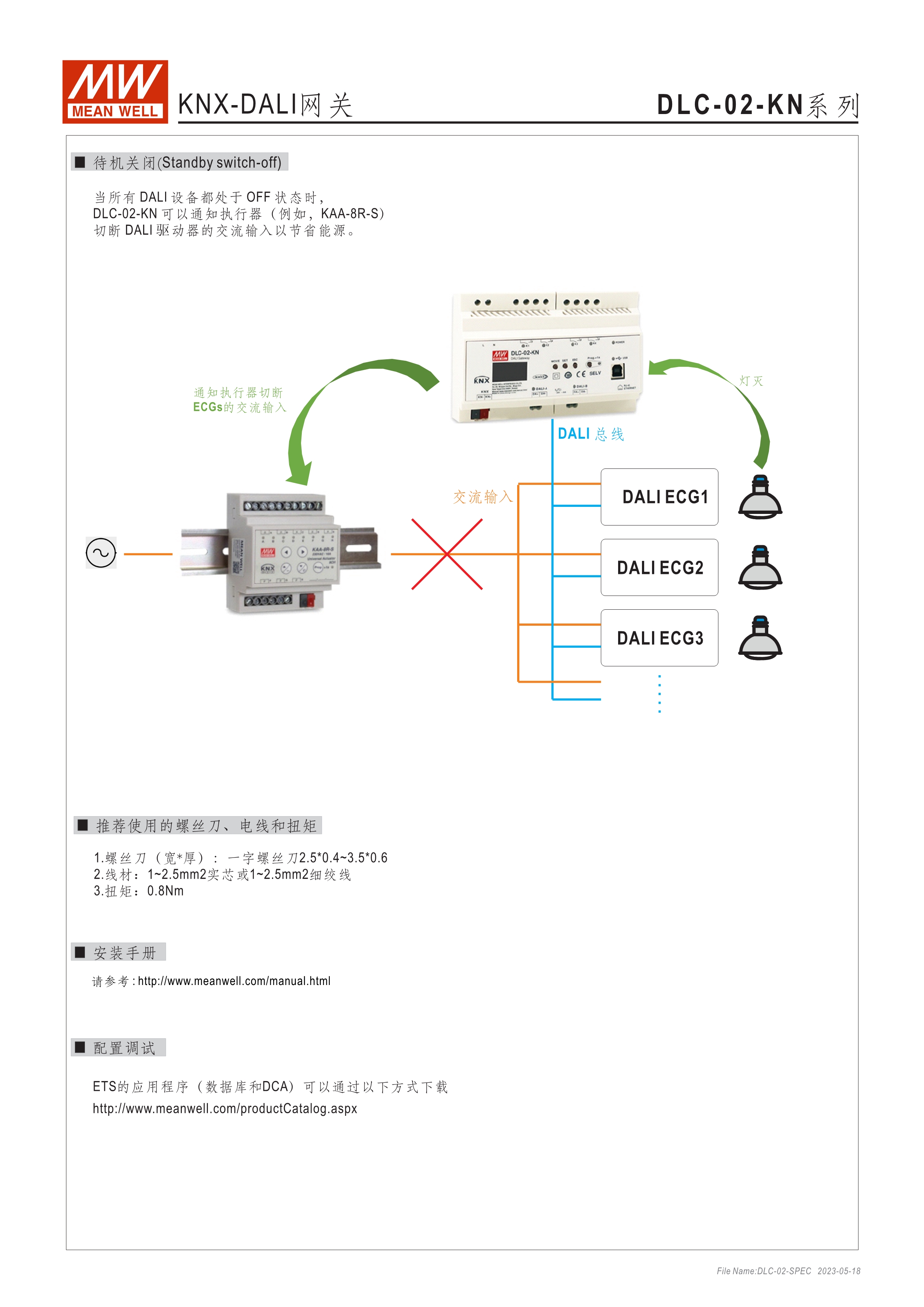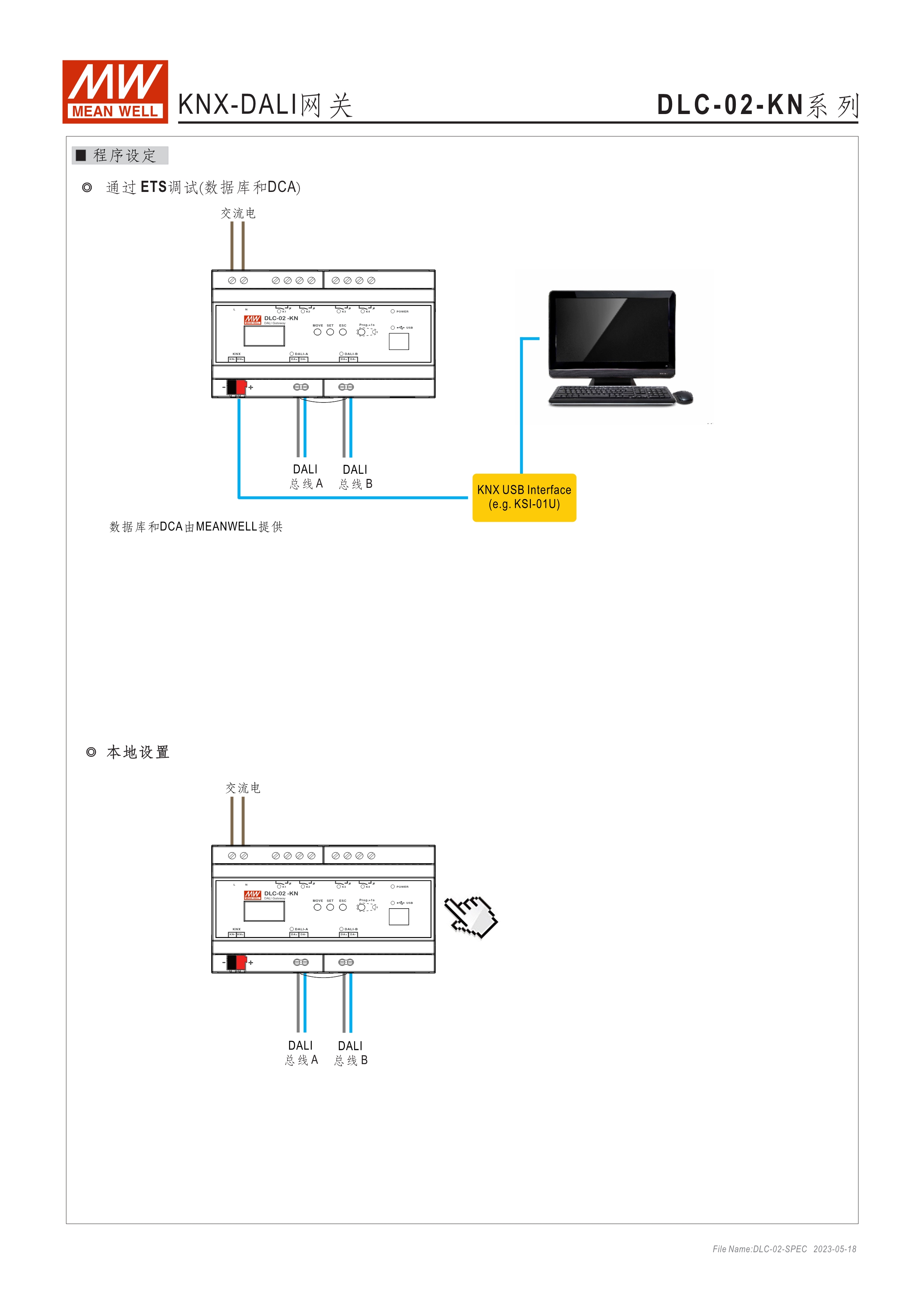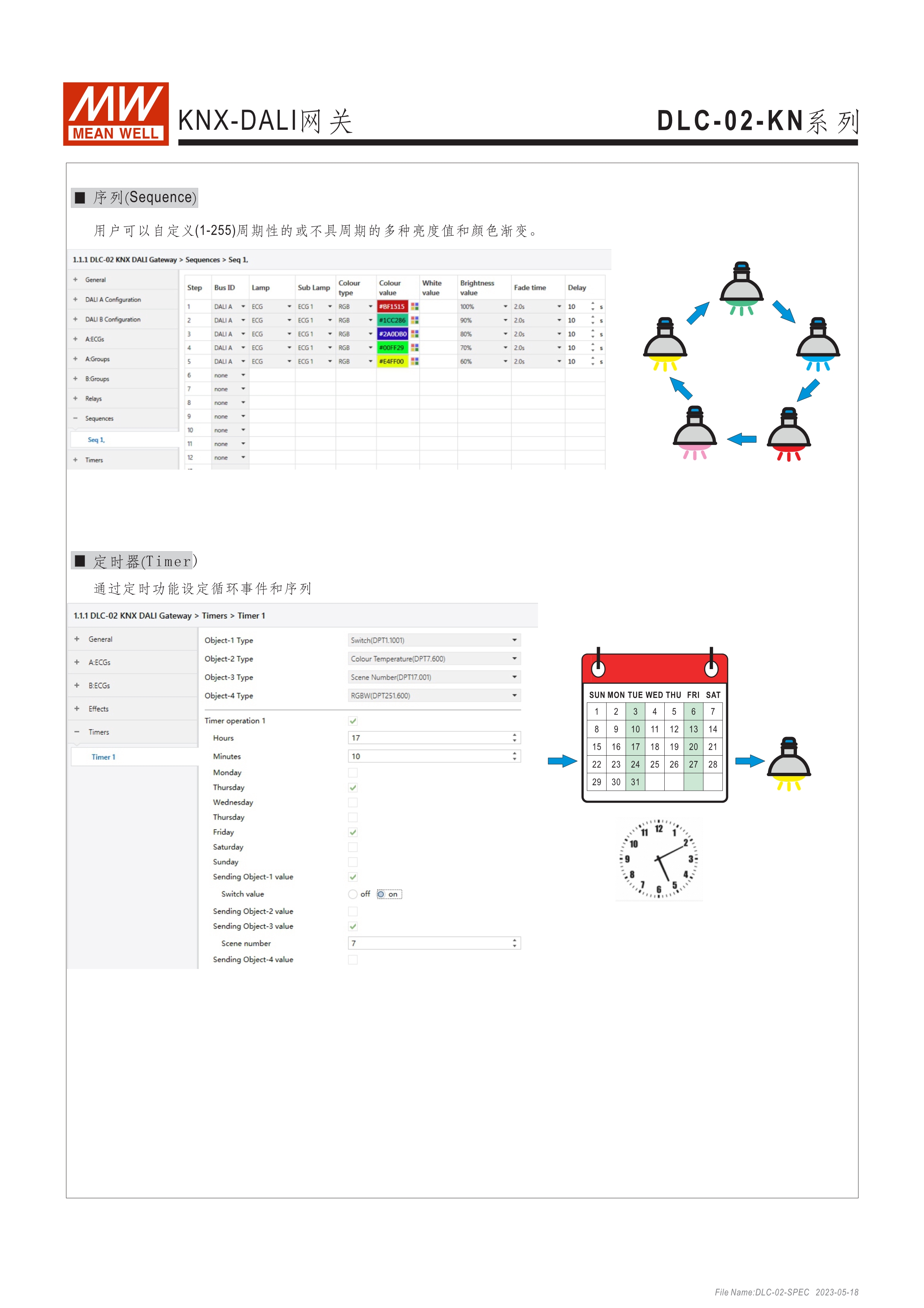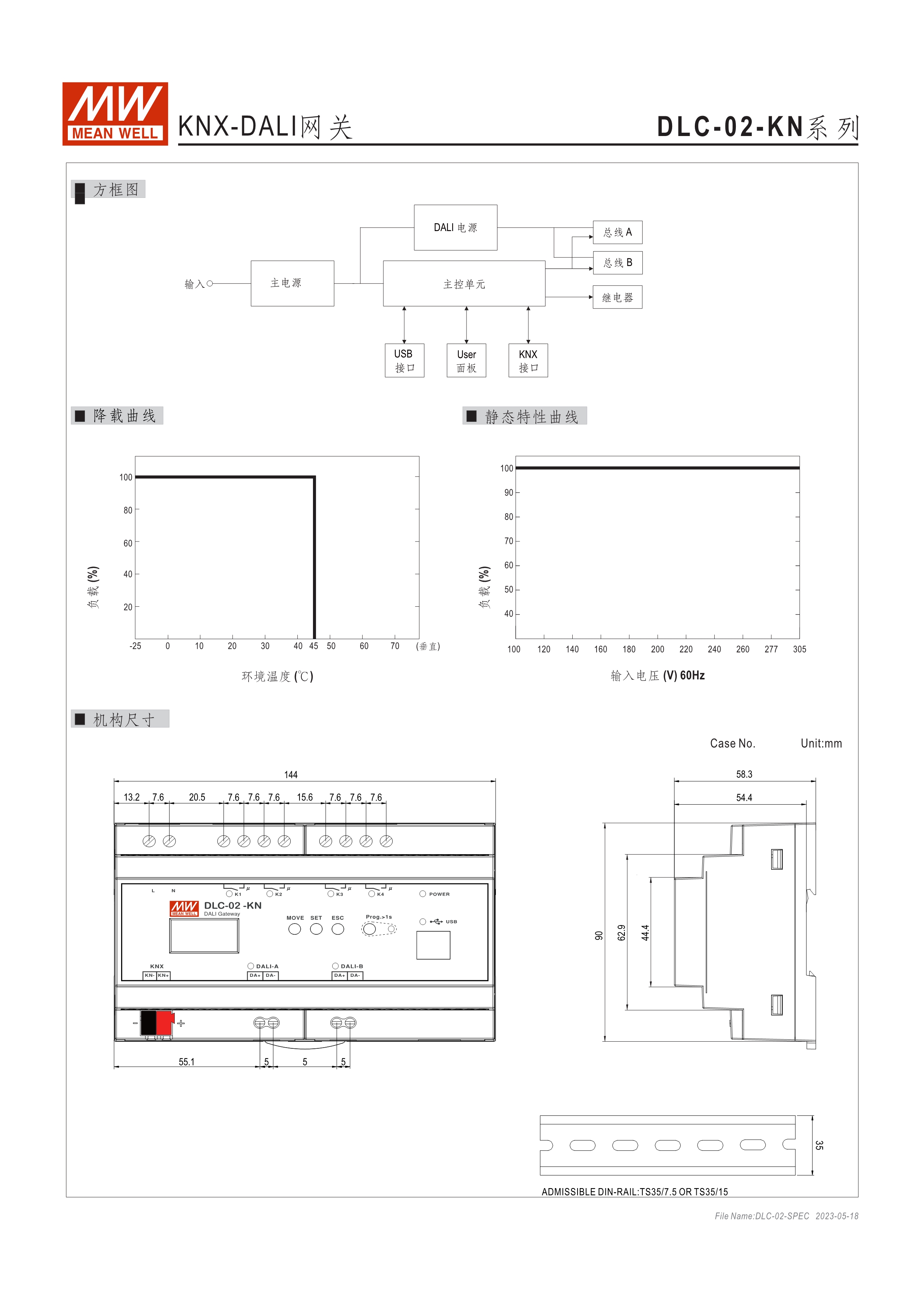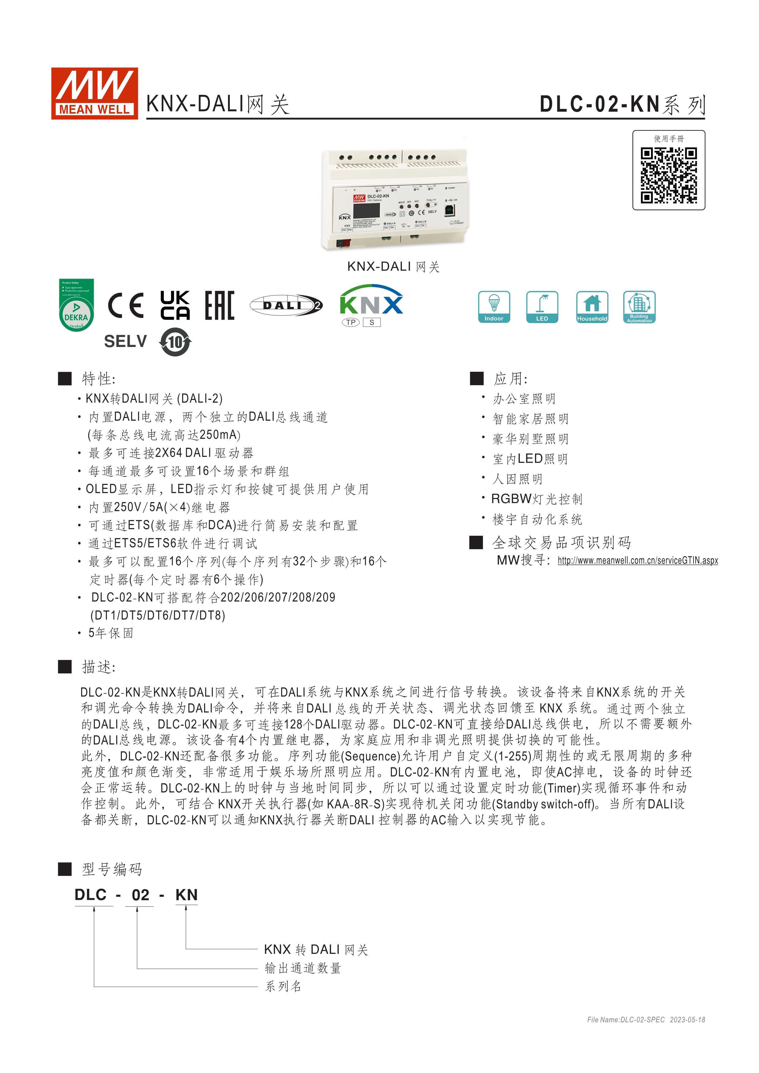符合IEC 62386 DALI-2,Part 101/103/207/208標準 2組獨立DALI總線,可接Control Gear及Control Device搭配使用 4路可控繼電器,接觸容量5A,可當電器開關(guān)或兩組電動窗簾使用 可搭配DLC軟體做現(xiàn)場系統(tǒng)設(shè)定,或透過網(wǎng)路線從遠端做修改設(shè)定 透過本體液晶顯示螢?zāi)患安倏匕粹o,可做簡單設(shè)定和狀態(tài)查詢 內(nèi)建Timer晶片,可搭配DLC軟體做行程控制設(shè)定 通訊介面接口:RJ-45及KNX,可與其他樓宇自動化系統(tǒng)做連線擴充使用 采導(dǎo)軌式設(shè)計,體積小巧僅8SU寬度(144x 90x 58.4mm)