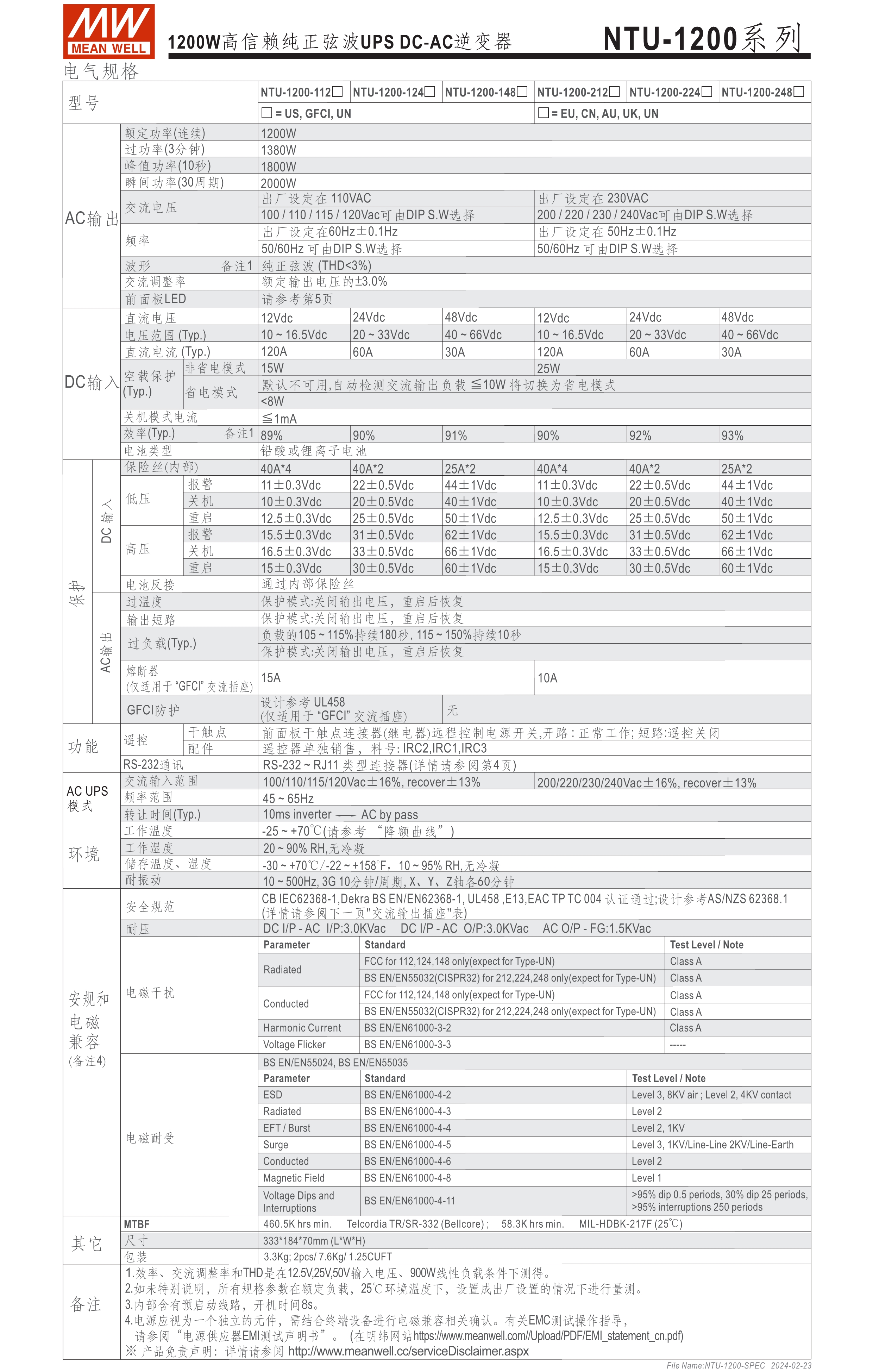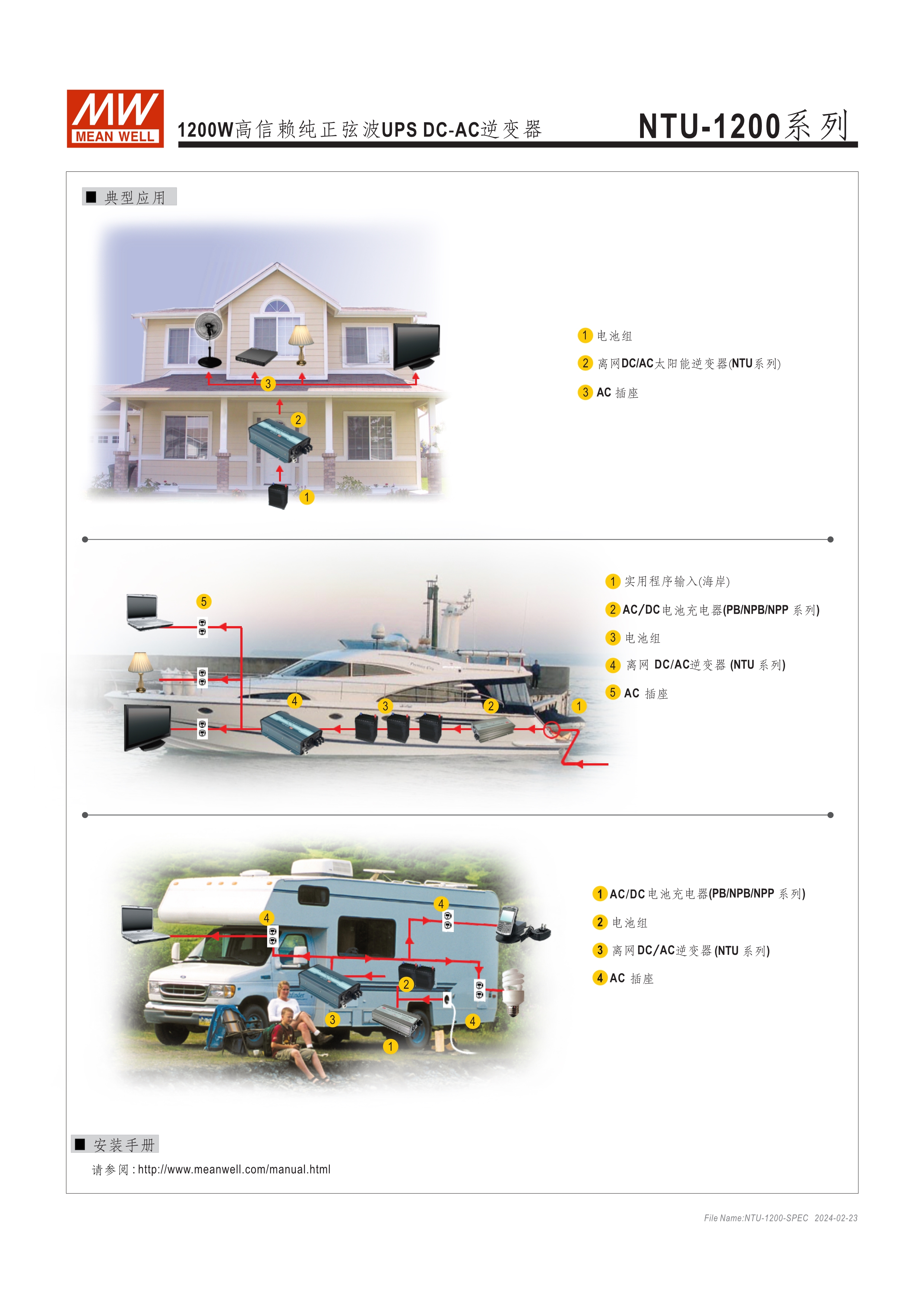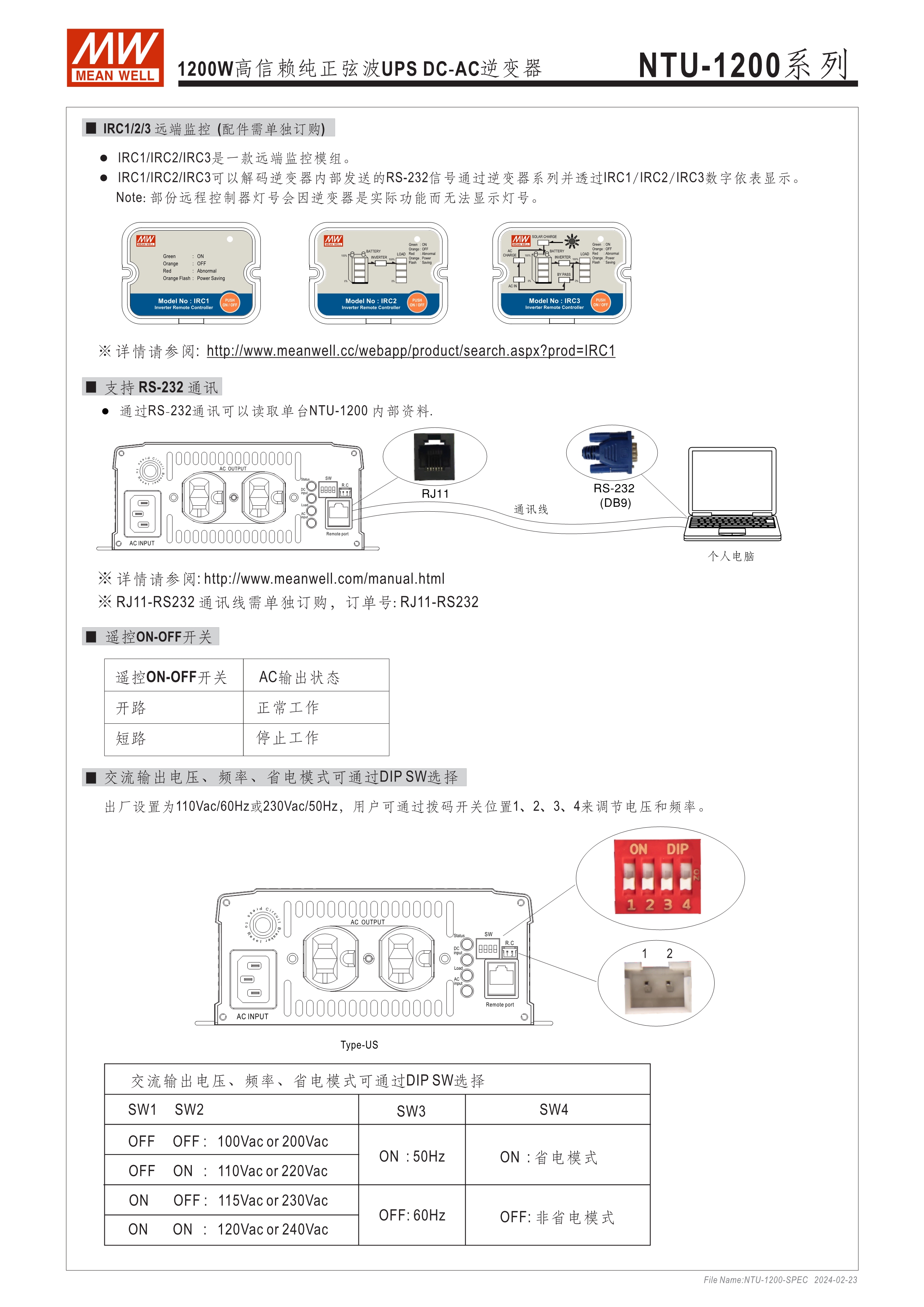 內(nèi)置UPS功能(交流旁路) DC-AC純正弦波輸出 (THD<3%) 可遠(yuǎn)距遙控 (IRC1, IRC2, IRC3) 多重智能保護(hù)功能: DC輸入側(cè) - 極性反接、電壓過低、電壓過高保護(hù) AC輸出側(cè) - 短路、超載、過熱保護(hù)