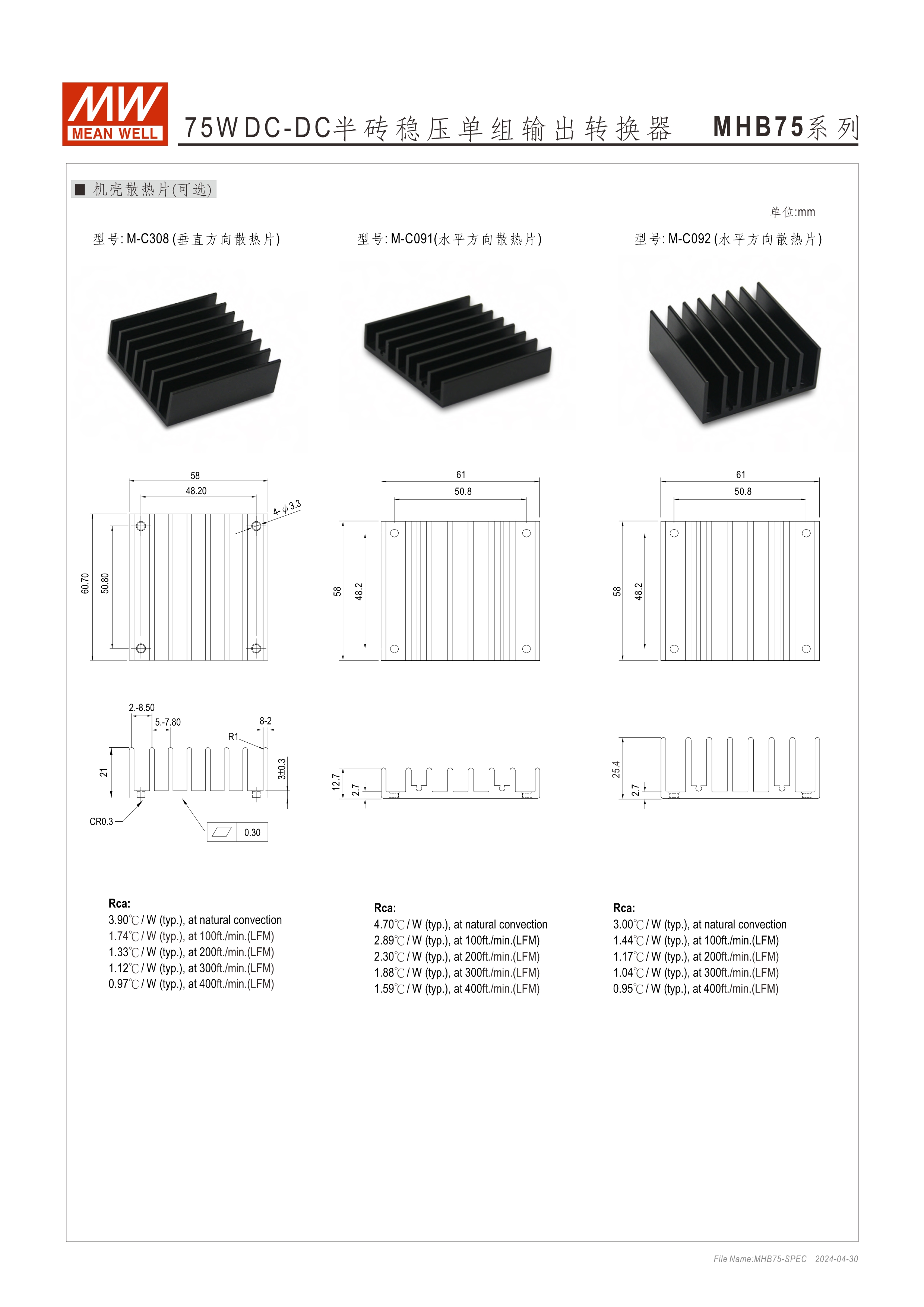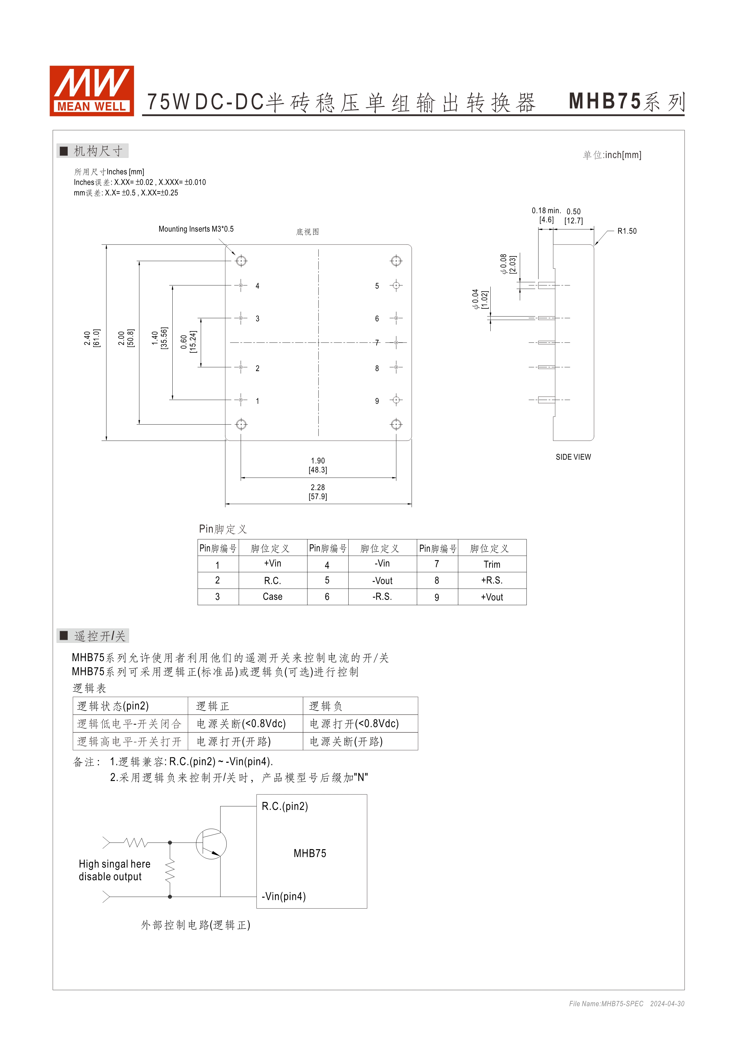 模塊型快選表 2.28” x 2.4” x 0.5”半磚尺寸 DIP封裝 2:1 寬輸入范圍 1.5KVDC 輸入/輸出隔離 內建遙控及遙感功能 可2.5V / 3.3V / 15V 輸出 可選購散熱片