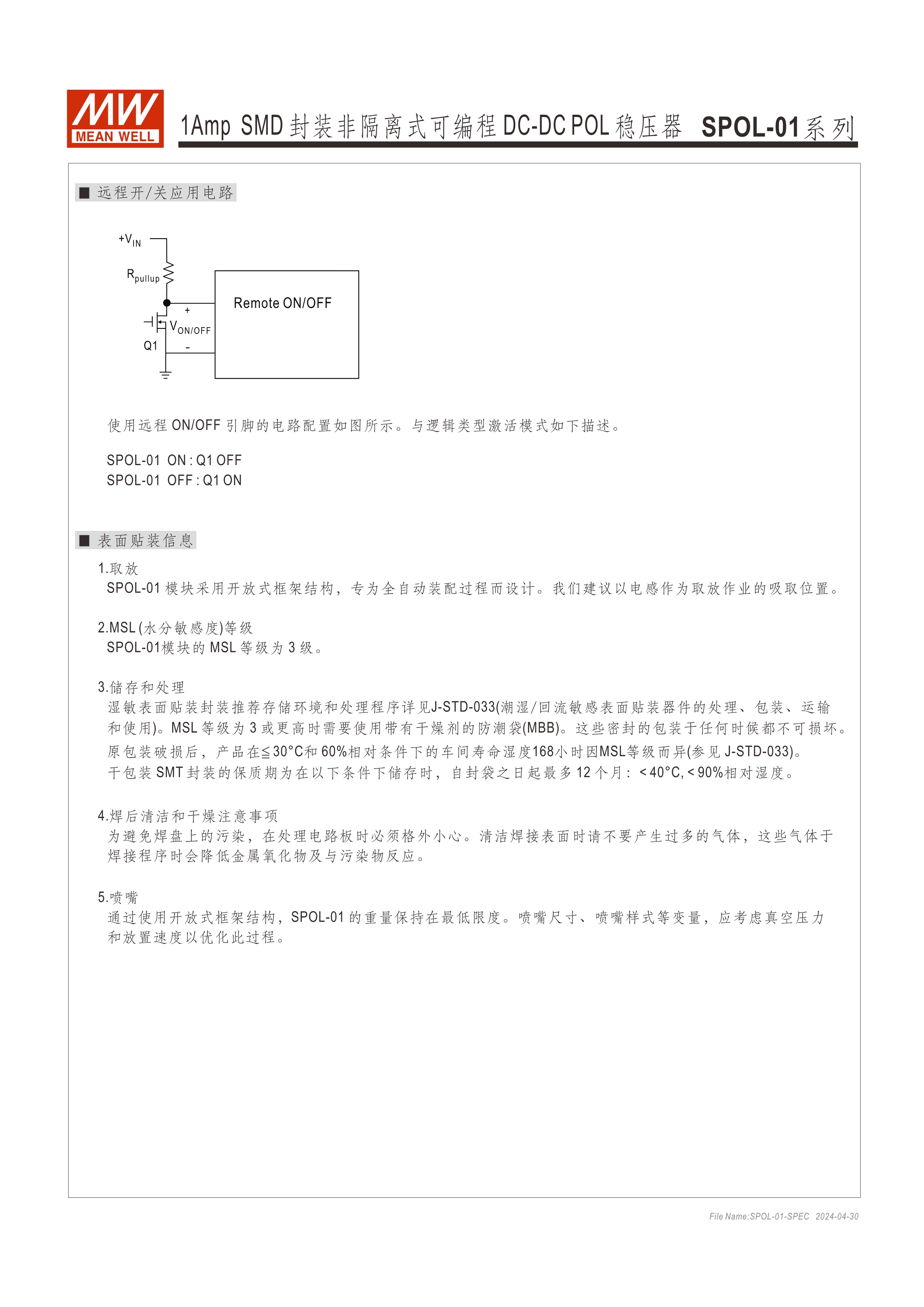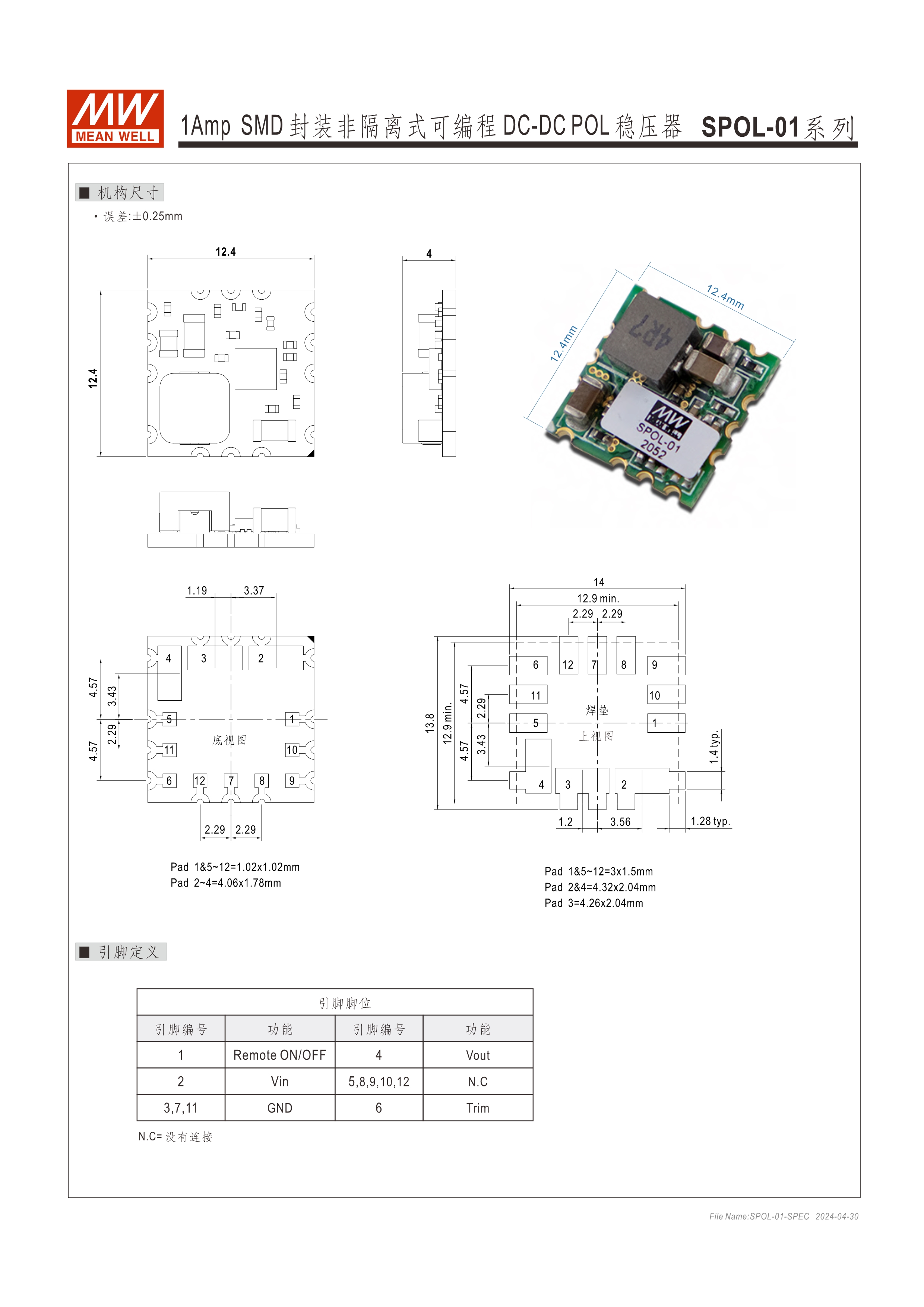 LGA (Land Grid Array) 表面貼裝 超小尺寸 (SPOL-01 : 12.4 x 12.4 x 4mm、SOPL-12 : 12.19 x 12.19 x 3.1mm) 寬壓輸入 (SPOL-01 : 3~14Vdc、SPOL-12 : 3~14.4Vdc ) 可程編輸出電壓 ( SPOL-01 : 0.9~5.5Vdc、SPOL-12 : 0.6~5.5Vdc ) 遙控ON/OFF功能 保護功能 : 短路 (可持續(xù)) 超寬溫 (SPOL-01 : -40~+82oC、SPOL-12 : -40~+90oC) 3年保固