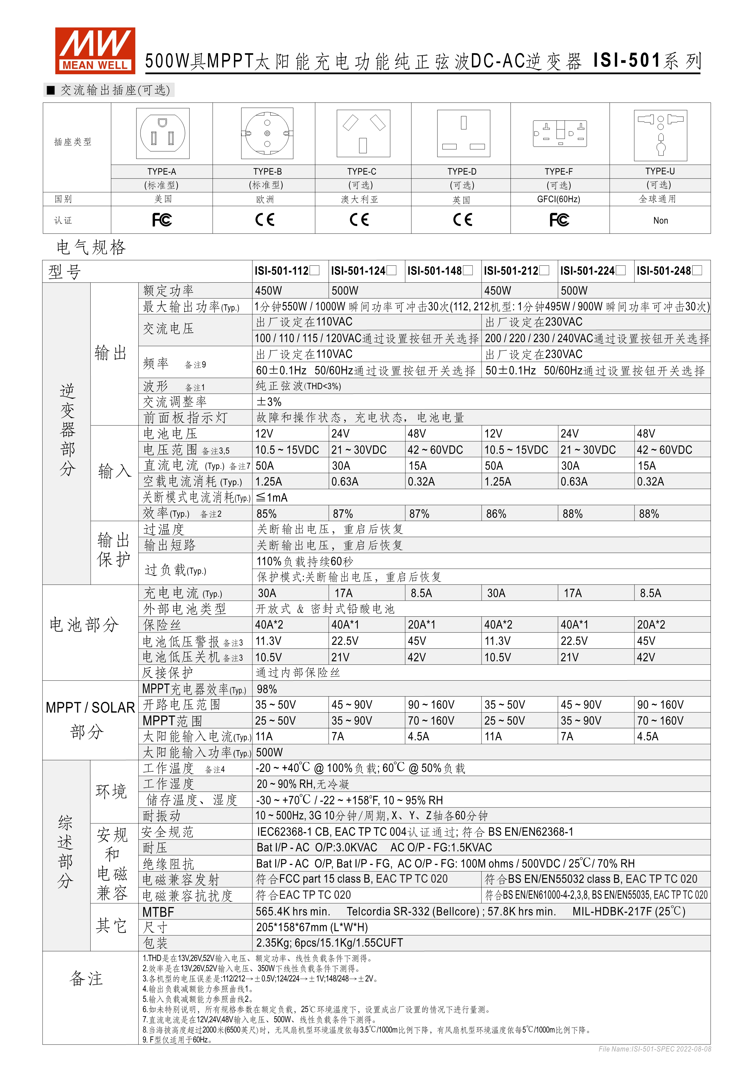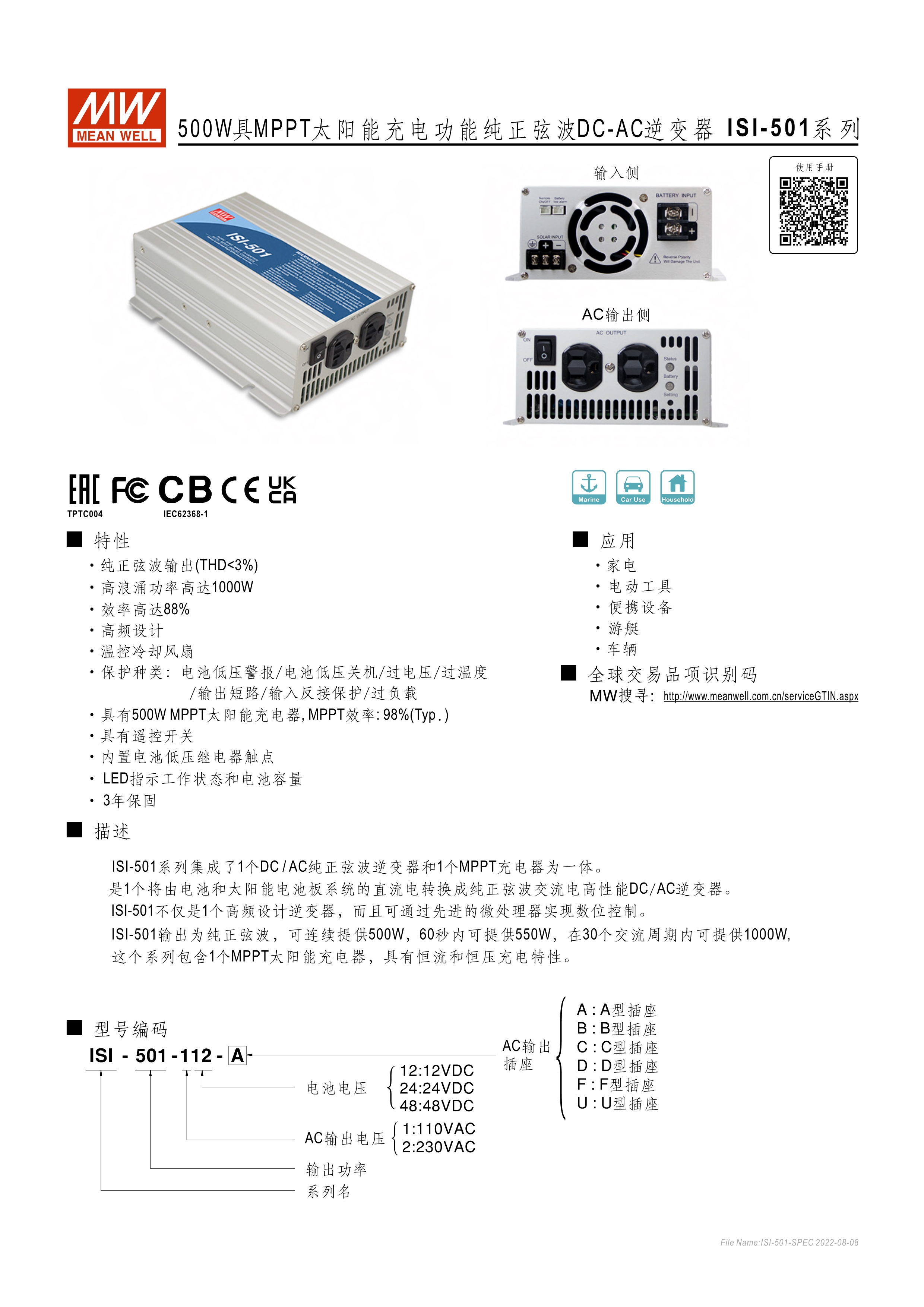 ISI-500: 內(nèi)建MPPT太陽能充電器方波輸出機種 ISI-501: 內(nèi)建MPPT太陽能充電器正弦波輸出機種 具備可瞬間承受200%輸出之能力 ISI-500系列為2年保固期; ISI-501系列為3年保固