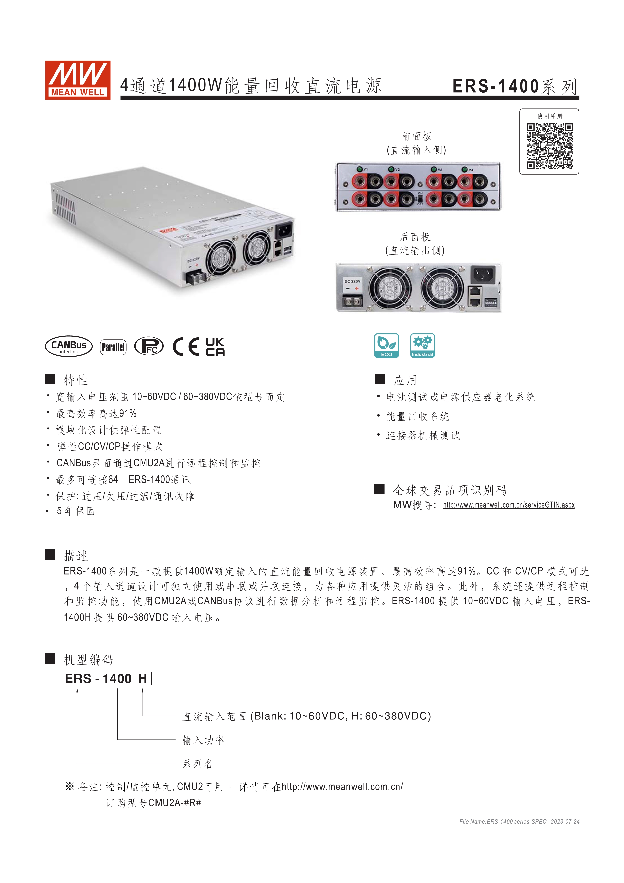 寬輸入電壓范圍10~60VDC/60~380VDC(視機(jī)型而定) 效率高達(dá)91% 靈活配置的模塊化設(shè)計(jì) 彈性的CC/CV/CP操作模式 通過(guò)CMU2A實(shí)現(xiàn)CAN總線協(xié)議遠(yuǎn)程控制和監(jiān)控控制 可連接最多64臺(tái)ERS-1400系列 保護(hù)功能: 過(guò)電壓、欠電壓、過(guò)熱、通信錯(cuò)誤 3年保固期